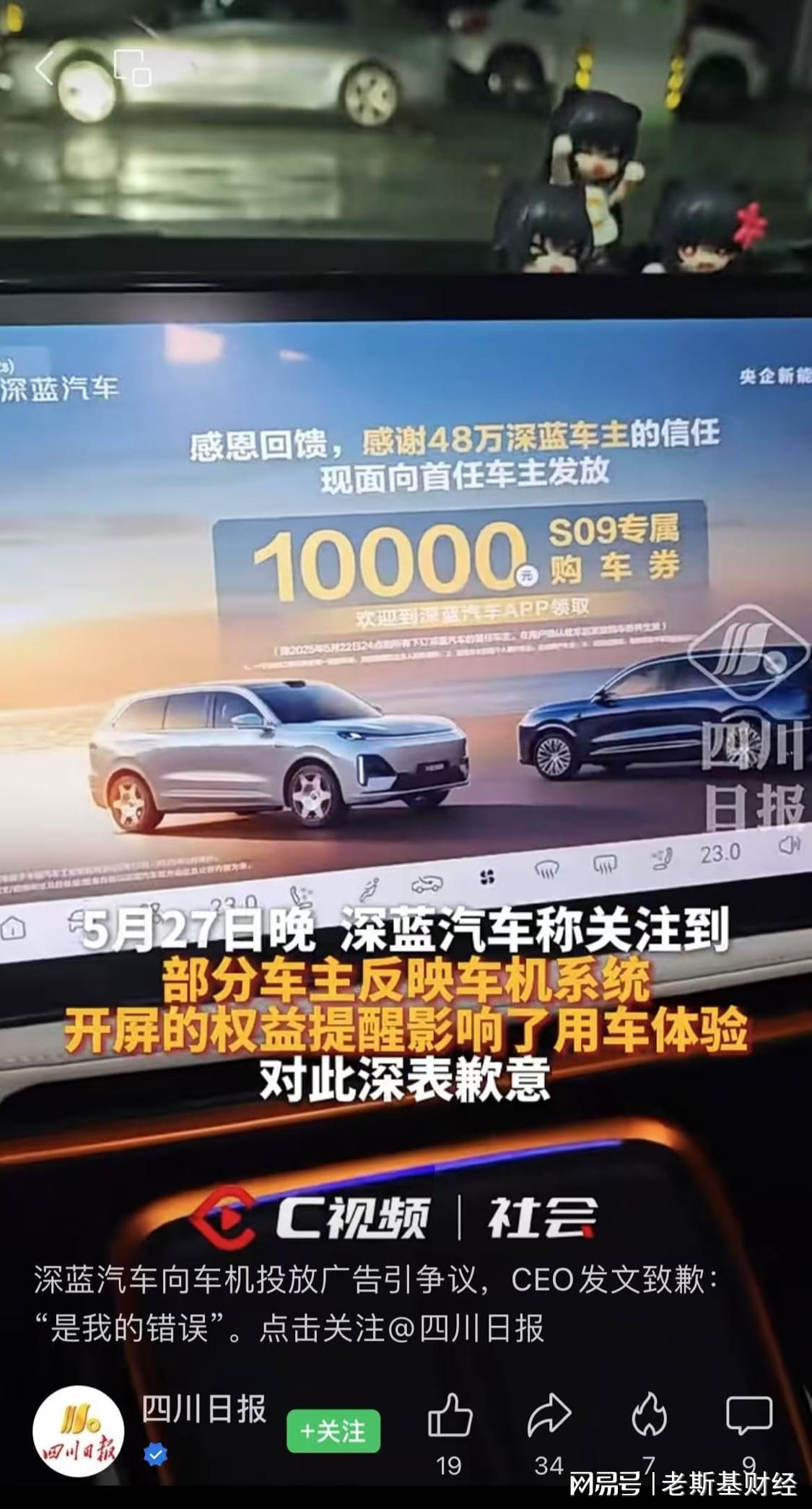 据说深蓝汽车为了给老车主提供感恩回馈,往大伙儿的车机内推送了广告,广告内容是: