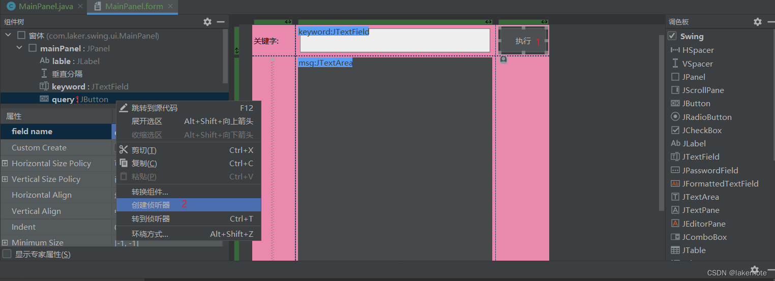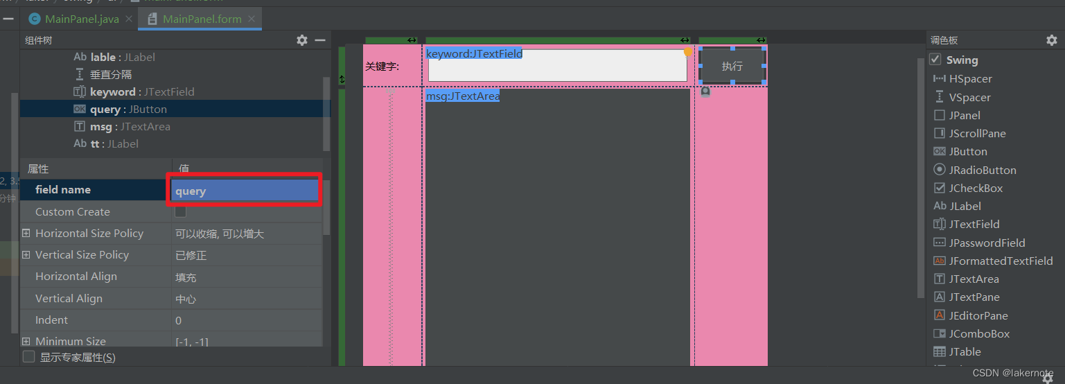 public class MainPanel {private JPanel mainPanel;private JLabel lable;private JTextField keyword;private JButton query;private JTextArea msg;private JLabel tt;public MainPanel() {query.addActionListener(new ActionListener() {@Overridepublic void actionPerformed(ActionEvent e) {// 获取输入框内容String keywordText = keyword.getText();System.out.println(keywordText);// 输出到 msgmsg.setText(keywordText);}});}