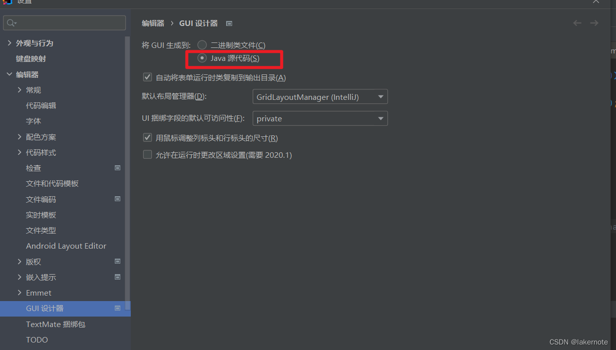第一步:设置将GUI生成到Java源代码