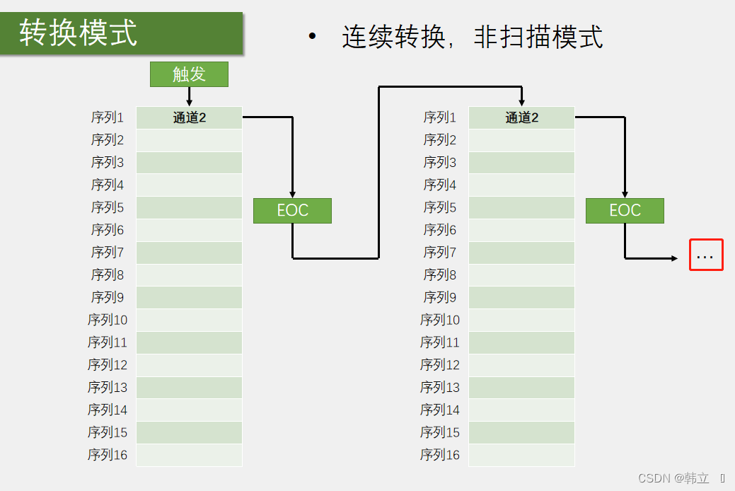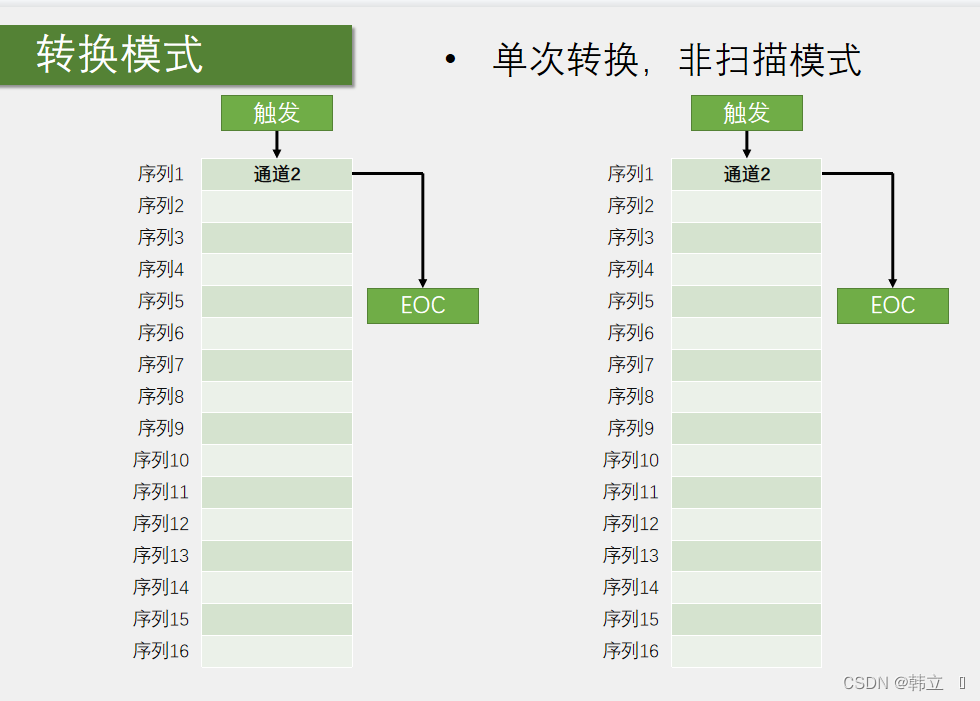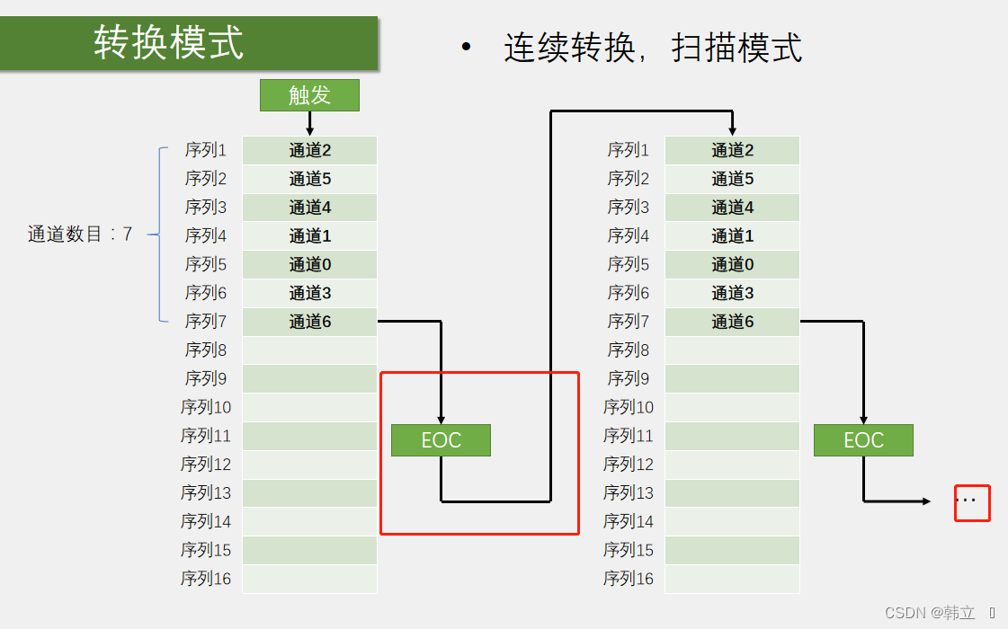 连续转换:每次从开始触发(软件触发或者硬件触发)到数据写入规则组数据寄存器后置EOC标志位,转换不结束,不需要再次触发,继续采集数据写入数据寄存器。