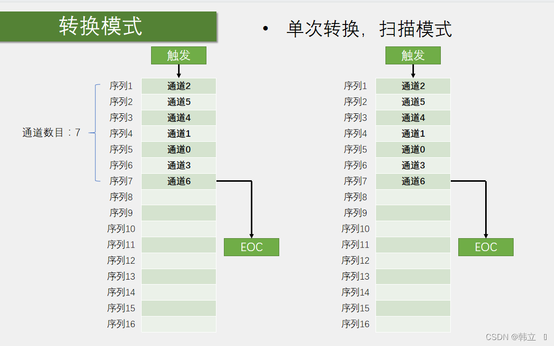 扫描模式:多通道采集数据,并在序列中指定好通道顺序,开始触发后,数据寄存器逐个写入指定序列中数据(会覆盖,因此采用这个模式需要配合DMA使用)序列中数据读完后置EOC标志位。