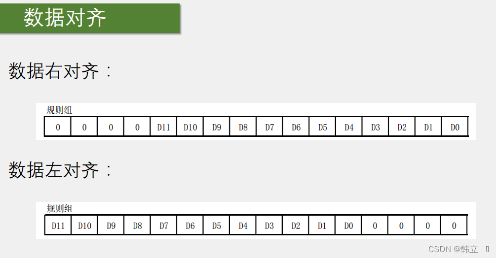 因为STM32中ADC是12位的,而ADC的数据寄存器是16位的,因此有两种对齐方式。其中左对齐会损失精度,右对齐不会。左对齐降低精度,只读高八位,舍去后四位。