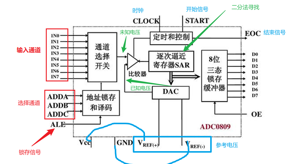 VREF与VCC相连,输入电压模拟量范围由VREF决定。