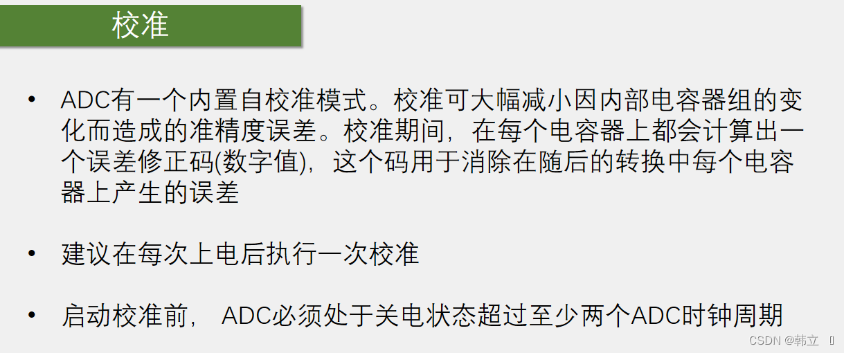 注:开启ADC后,根据手册建议,可以对ADC进行校准,减小误差。在ADC工作时,如果想要软件触发转换,那会有函数可以触发;如果想读取转换结果,那也会有函数可以读取结果。