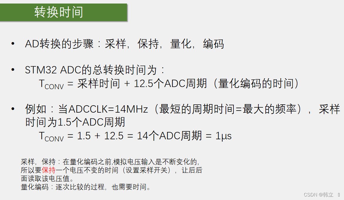 分辨率含义:0 ~ 2^12,即0 ~ 4095 ,位数越高量化结果越精细,分辨率越高