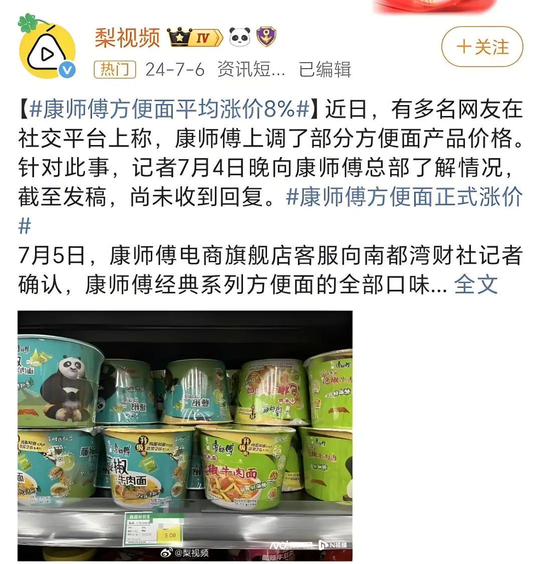 据《中国食品报》等多家媒体此前报道,早在2024年5月,康师傅旗下的方便面产品就曾因涨价冲上微博热搜。袋装方便面零售价从2.8元上调至3元,桶装方便面则从4.5元上调至5元,康师傅方便面平均涨价8%。而且,其一升装冰红茶等饮品售价也从4元提升到了5元。