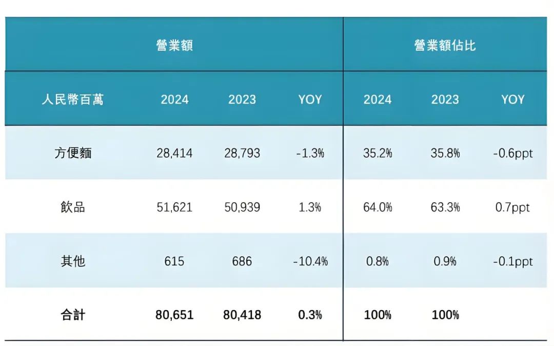 这里有财报数据作为支撑。根据日前康师傅控股发布的2024年财报显示,去年公司实现营收806.51亿元,同比微增0.3%;实现公司股东应占溢利37.3亿元,同比增长19.8%。其中,方便面业务贡献营收284.14亿元,同比减少1.3%,连续两年萎缩(2023年下降2.84%)。