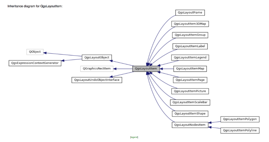 人们添加到打印布局中的常见内容包括地图、图例、标签、比例尺、北箭头等。在本例中,我将介绍地图、图例和标签。这里是对QgsLayoutItem类文档的参考。您将看到这个类是所有QgsLayoutItems的构造函数,其中有很多。下面是继承图: