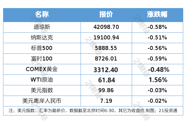 纽约股市三大股指5月28日集体下跌。截至当天收盘,道琼斯工业平均指数比前一交易日下跌244.95点,收于42098.70点,跌幅为0.58%;标准普尔500种股票指数下跌32.99点,收于5888.55点,跌幅为0.56%;纳斯达克综合指数下跌98.23点,收于19100.94点,跌幅为0.51%。