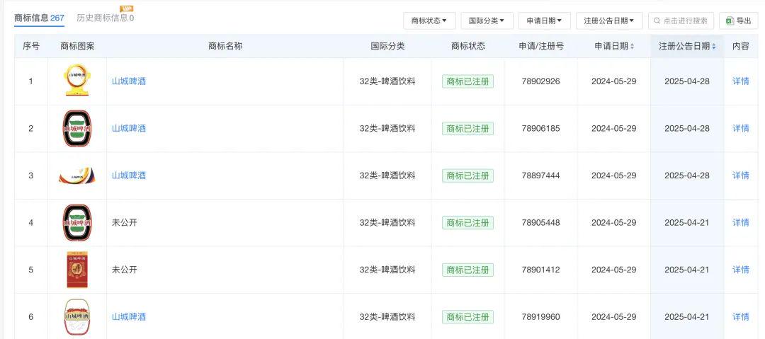 据中国商标网数据,2024年以来,嘉士伯重庆已累计提交15件“山城啤酒”商标申请,涵盖多种文字、图形设计。