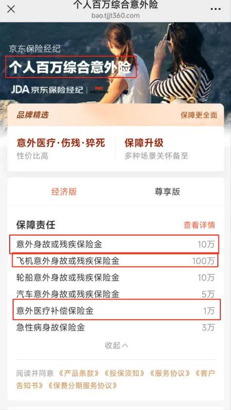 例如,在京东保险经纪平台销售的个人百万综合意外险(人保财险),宣称的“百万”保额仅仅是指航空意外责任,核心的意外身故保险金只有10万元。