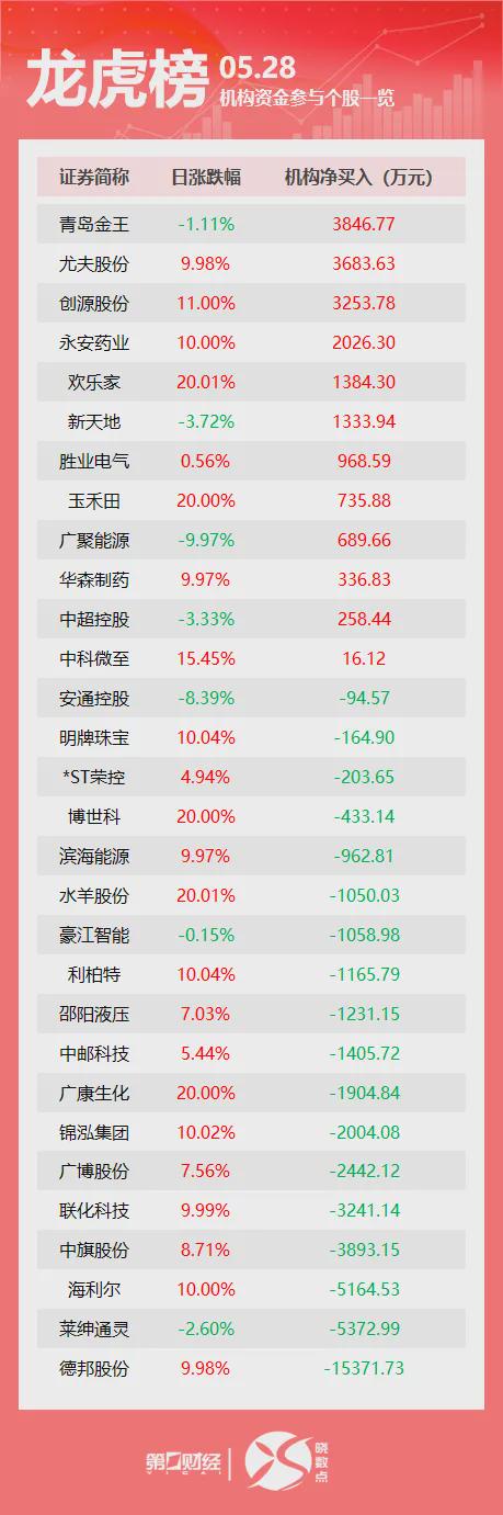 5月28日龙虎榜中,共30只个股出现了机构的身影,12只股票呈现机构净买入,18只股票呈现机构净卖出。当天机构净买入前三的股票分别是青岛金王、尤夫股份、创源股份;当天机构净卖出前三的股票分别是德邦股份、莱绅通灵、海利尔。