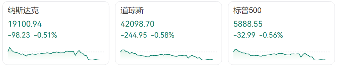 截至收盘,道指跌244.95点,跌幅0.58%,报42098.70点,纳指跌0.51%,报19100.94点,标普500指数跌0.56%,报5888.55点。