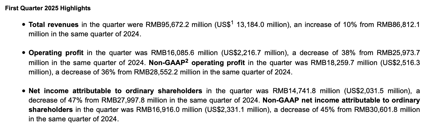 5月27日晚,拼多多发布了2025年第一季度财报,财报显示,一季度拼多多实现营收957亿元,同比增长10%;实现营业利润161亿元,同比下降38%;实现归母净利润147亿元,同比下降47%;调整后净利润为169亿元,同比下降45%。