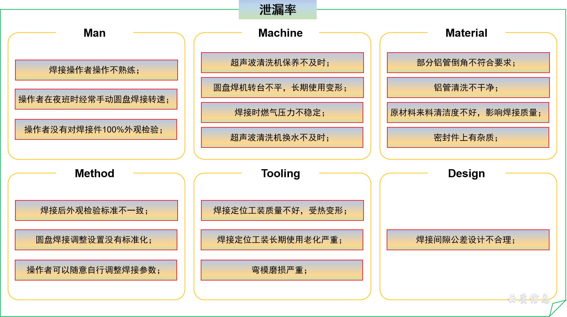 前面的系列文章中提到,某公司总成件AT25 B88 2020的泄漏率非常高。为了降低泄露率,质量主管带领团队在生产进行了实地调研,然后组织了一次头脑风暴会,收集到的事实资料如下表: