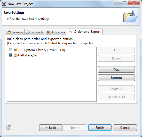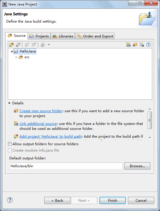 (3) 单击“Finish(完成)”按钮,创建名为 HelloJava 的项目,Eclipse 会自动生成相关代码和布局结构。在 Eclipse 左侧“Package Explorer(包资源管理器)”窗格中会显示整个 Java 项目的目录结构,默认为空项目。