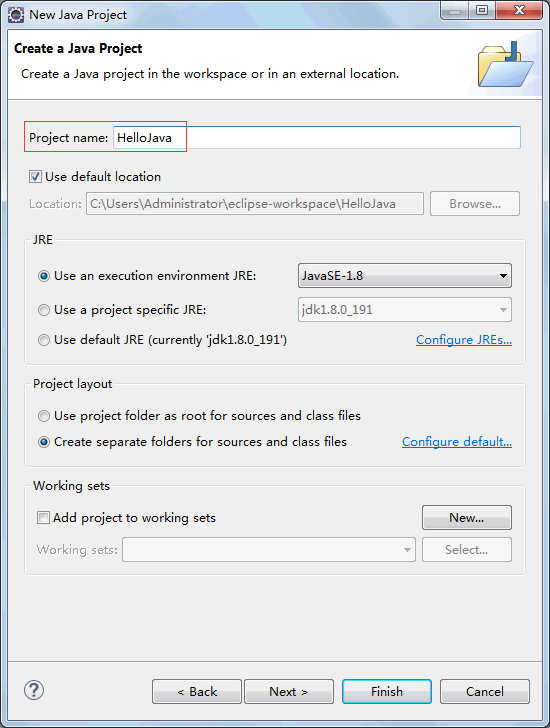 (2) 设置“Project name(项目名)”为 HelloJava,选中“Use default location(使用缺省位置)”复选框,将项目保存到工作空间中,其他暂时不用设置,如图 1 所示。