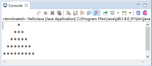2) 编写完成之后按 Ctrl+S 快捷键保存修改。在工具栏中单击“运行”按钮后,如果程序没有编译错误,在底部的“Console(控制台)”窗格中会看到输出的等腰三角形,这就是程序的运行效果,如图 9 所示。