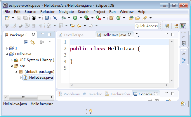 (7) 最后单击“Finish(完成)”按钮,会看到生成的 HelloJava.java 文件的内容,并处于编辑状态,如图 7 所示。