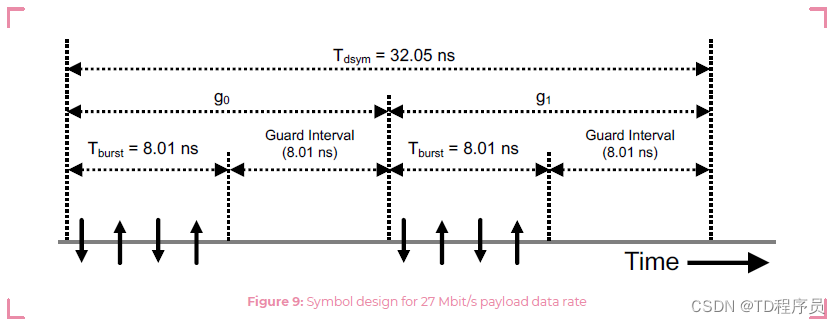 第二,对于HPRF数据调制方案,在每个数据位的脉冲数、每个数据位的通话时间、瞬时功率放大器(PA)峰值功率、符合监管峰值EIRP限制(即发射功率掩码)以及由于与多径无线电信道条件相关的符号间干扰而导致的预期损失之间达成平衡。因此,定义了两种新的数据调制方案,有效负载数据速率为6.8 Mbit/s(针对每个数据位的大量脉冲)和27 Mbit/s(针对每个数据位的短通话时间)。新的数据调制方案分别如下图所示。在这两种情况下,卷积编码器输出位(g0和g1)分别确定数据符号内第一个和第二个突发的BPSK调制。