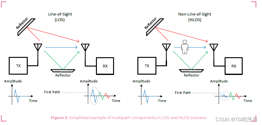 决定TOF测距系统性能的另一个核心因素是接收机准确确定传入(无线电)包的到达时间(TOA)的能力,特别是与直接或视线(LOS)路径相关的TOA。确定LOS TOA可能具有挑战性,特别是当LOS路径被遮挡(例如,由人体衰减,见下图),同时存在强反射路径时。在这种情况下,接收机需要提供高动态范围才能成功检测到LOS TOA。用于表示接收机动态范围的关键指标是反射路径强度与直接路径强度之间的最大比值,其中直接路径仍然被可靠地检测到