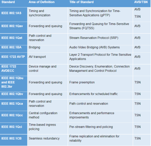 IEEE 802.1 TSN(Time-Sensitive Networking) 工作组定义了一个基于 802.x 网络架构上提供同步时间低延迟服务能力的协议,其前身为 IEEE AVB(Audio Video Bridgin) 工作组,后于2012年重命名为 TSN 工作组以便于将相关协议标准更广泛推广; AVB/TSN 包含多种具体协议标准(见如下表格),其中最重要的协议标准之一就是 IEEE 802.1AS 时钟同步协议标准,它基于 IEEE 1588 协议进行精简和修改,也称为 gPTP 协议。