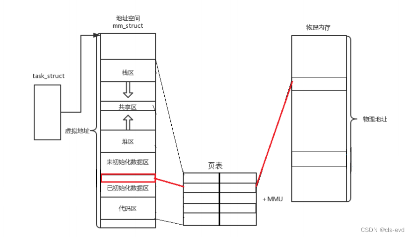 每个进程都有自己对应的PCB和独立的地址空间,我们的进程所看到的地址并不是物理内存上的地址,而是由mm_struct中每个区域衍生出来的地址,叫做虚拟地址(在linux中也叫做线性地址)。可是光有地址是无用的,必须有代码和数据,代码和数据是在物理内存上存着的,这时候就引入一个新的概念:页表+MMU。MMU是一种硬件,功能是查页表。页表是操作系统的每个进程维护的一张表,可以简单的理解成这个表的左侧是虚拟地址,右侧是物理地址,功能就是将虚拟地址转化成物理地址,所以这张页表本质上就是一张映射表或者叫做一张hash表。进程在实际寻址时,应用层用的是虚拟地址,OS会根据页表将虚拟地址转换成物理地址进而寻找代码和数据。