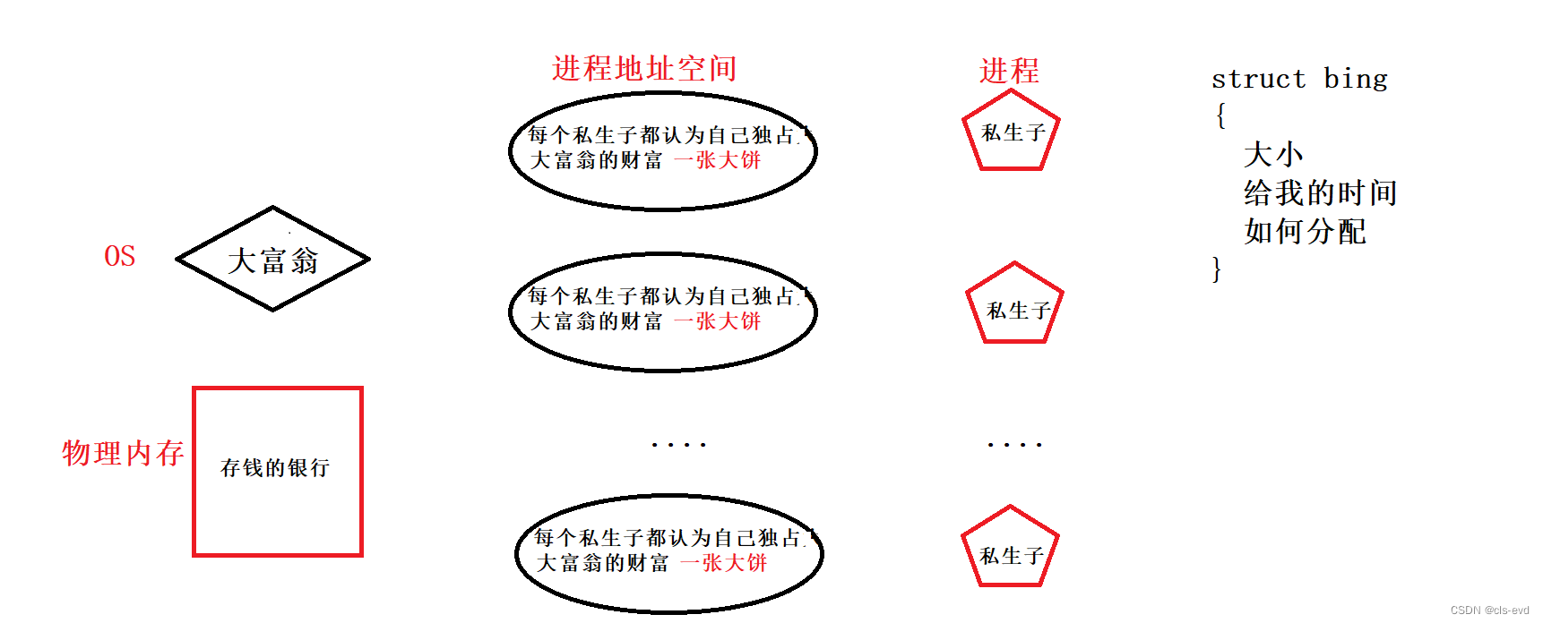 比如说这里有一个富豪叫做大富翁身价100亿$,他有10个私生子,但是他们彼此之间都不知道其他人的存在,这样每个私生子都认为他有一个爹叫做大富翁,并且大富翁只有他这一个儿子,所以大富翁就给他的私生子分别说:“小a/b/c/d/e/f....啊,你好好学习,将来等我老去了,你继承我的100个亿。”10个私生子都分别说了这番话,因为10个私生子都不知道其他私生子的存在,所以他们都认为自己在独占大富翁的财富。大富翁为什么要给每个私生子都画了一张大饼呢?这里每个私生子都认为自己将来会有100个亿,所以每个私生子都按照100个亿规划自己的人生,这样的好处是简化私生子处理钱的方式,让每个人都认为自己有10个亿,以统一的方式规划花钱方式。只要每个孩子问大富翁要钱,大富翁都会尽量满足他们,每个私生子依旧会认为自己有100个亿,另外如果10个私生子都向大富翁要50个亿,这种情况是一般不会发生的,一来大富翁可以拒绝,拒绝了以后你依旧认为自己是100个亿的继承人,二来正常人几乎是不会要这么多的(滑稽),所以此时的大富翁是操作系统,各个私生子是进程,大富翁钱所在的银行是物理内存,操作系统给每个进程画的大饼叫做进程地址空间。