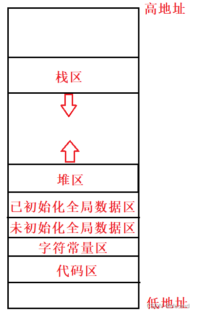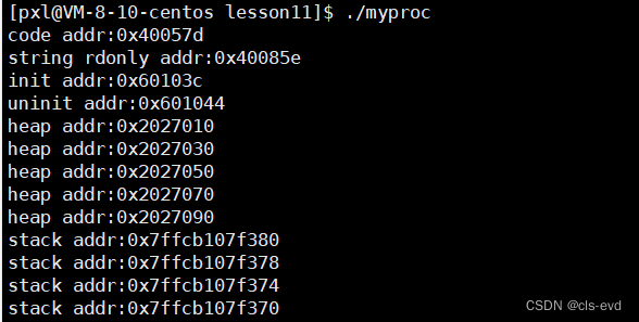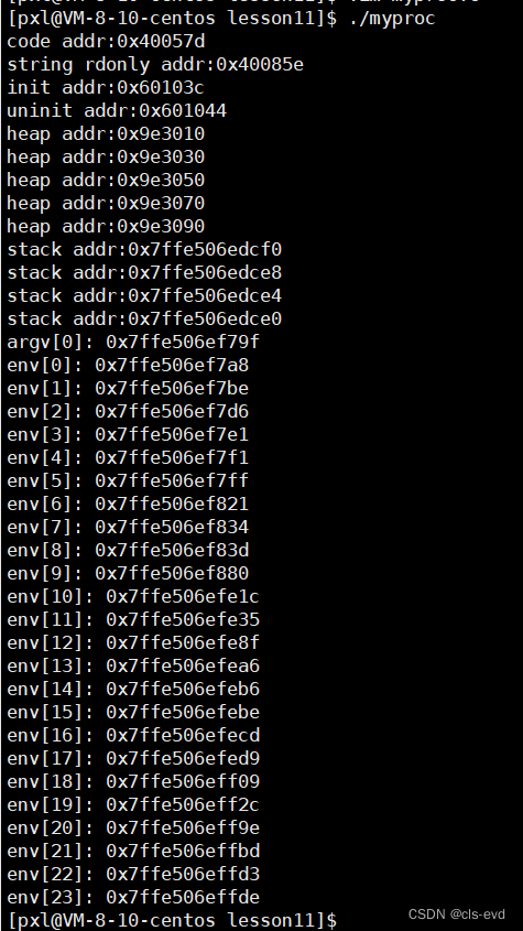#include#include #include #include int g_unval; int g_val=100; int main(int argc,char *argv[],char *env[]) { printf("code addr:%p\n",main); //main函数就是代码区的代表,函数名就代表地址 const char *s="hello world"; printf("string rdonly addr:%p\n",s); //取的是字符串的起始地址,所以不是&s printf("init addr:%p\n",&g_val); //全局变量会自动初始化,不同的编译器呈现不同的表现,实际上 //一个全局变量没有做初始化值的设定,它的值在编译程序的时候是默认没有给它空间的,只有在程序加载的时候 //才给空间。加载时才给值,这个全局变量的值给多少就与编译器有关系。有的是0,有的是其他值。(可执行程序的格式,ELF格式) printf("uninit addr:%p\n",&g_unval); char *heap=(char*)malloc(10); char *heap1=(char*)malloc(10); char *heap2=(char*)malloc(10); char *heap3=(char*)malloc(10); char *heap4=(char*)malloc(10); printf("heap addr:%p\n",heap); //&heap就取到了栈上的地址,heap是栈上开辟的一个指针变量 printf("heap addr:%p\n",heap1); //&heap就取到了栈上的地址,heap是栈上开辟的一个指针变量 printf("heap addr:%p\n",heap2); //&heap就取到了栈上的地址,heap是栈上开辟的一个指针变量 printf("heap addr:%p\n",heap3); //&heap就取到了栈上的地址,heap是栈上开辟的一个指针变量 printf("heap addr:%p\n",heap4); //&heap就取到了栈上的地址,heap是栈上开辟的一个指针变量 printf("stack addr:%p\n",&s); printf("stack addr:%p\n",&heap); int a=10; int b=30; printf("stack addr:%p\n",&a);printf("stack addr:%p\n",&b);for(int i=0;argv[i];i++){printf("argv[%d]: %p\n",i,argv[i]);}for(int i=0;env[i];i++){printf("env[%d]: %p\n",i,env[i]);}} 结果如下:
