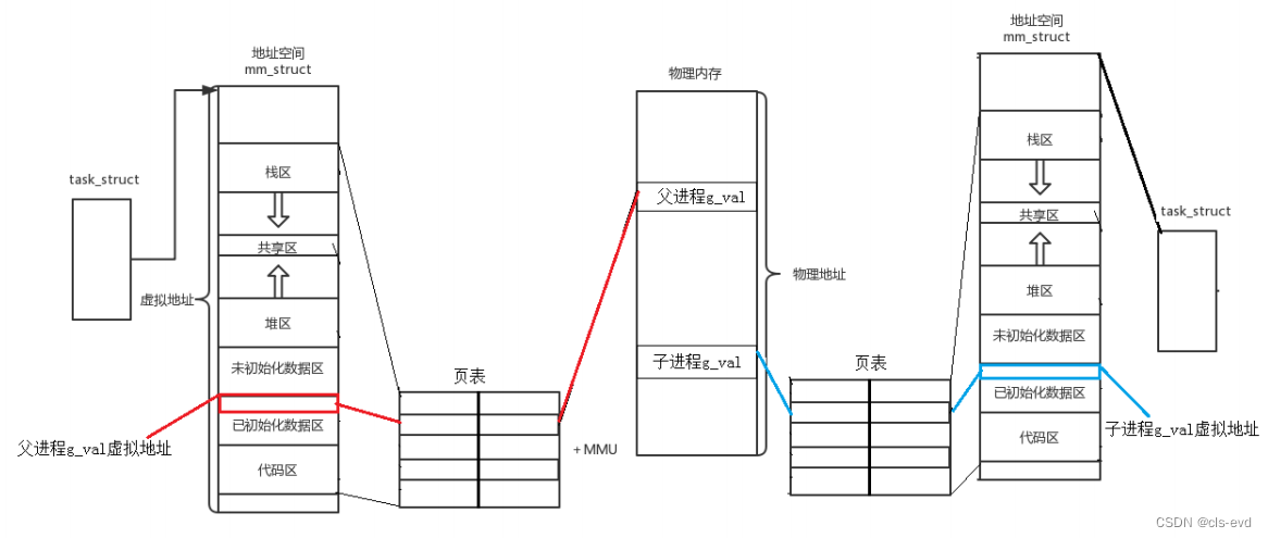 子进程的创建是以父进程为模板的,子进程的地址空间和页表大部分也和父进程一样,所以再开始创建的时候子进程的g_val也执向父进程那一块,所以父进程和子进程打出来的值一样,地址一样,但实际上是不同的进程地址空间的地址,后来子进程把值改了,因为进程是具有独立性的,所以发生了写时拷贝(重新开辟一段物理空间),然后把新空间在建立与地址空间的映射,所以打出来的地址一样,值不一样,虚拟地址没变。父子进程一般的代码是享的。所以,所有只读的数据一般可以只有一份。