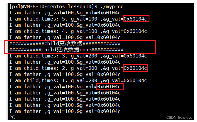我们发现父子进程对应的地址,在子进程更改数据后是没有变化的 !因为如果子进程更改数据后发生了写时拷贝,这样两个数据是独立的,g_val的地址是一定会发生变化的。