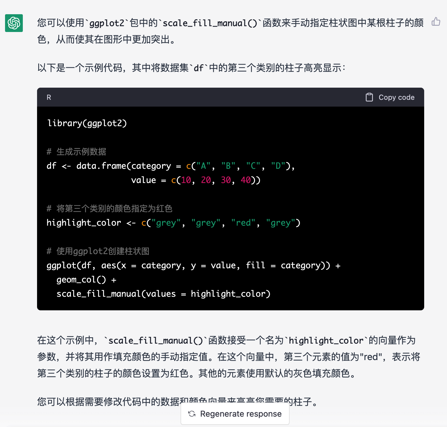 直接使用 {ggplot2} 包中的 scale_fill_manual() 函数来手动指定柱状图中某根柱子的颜色。