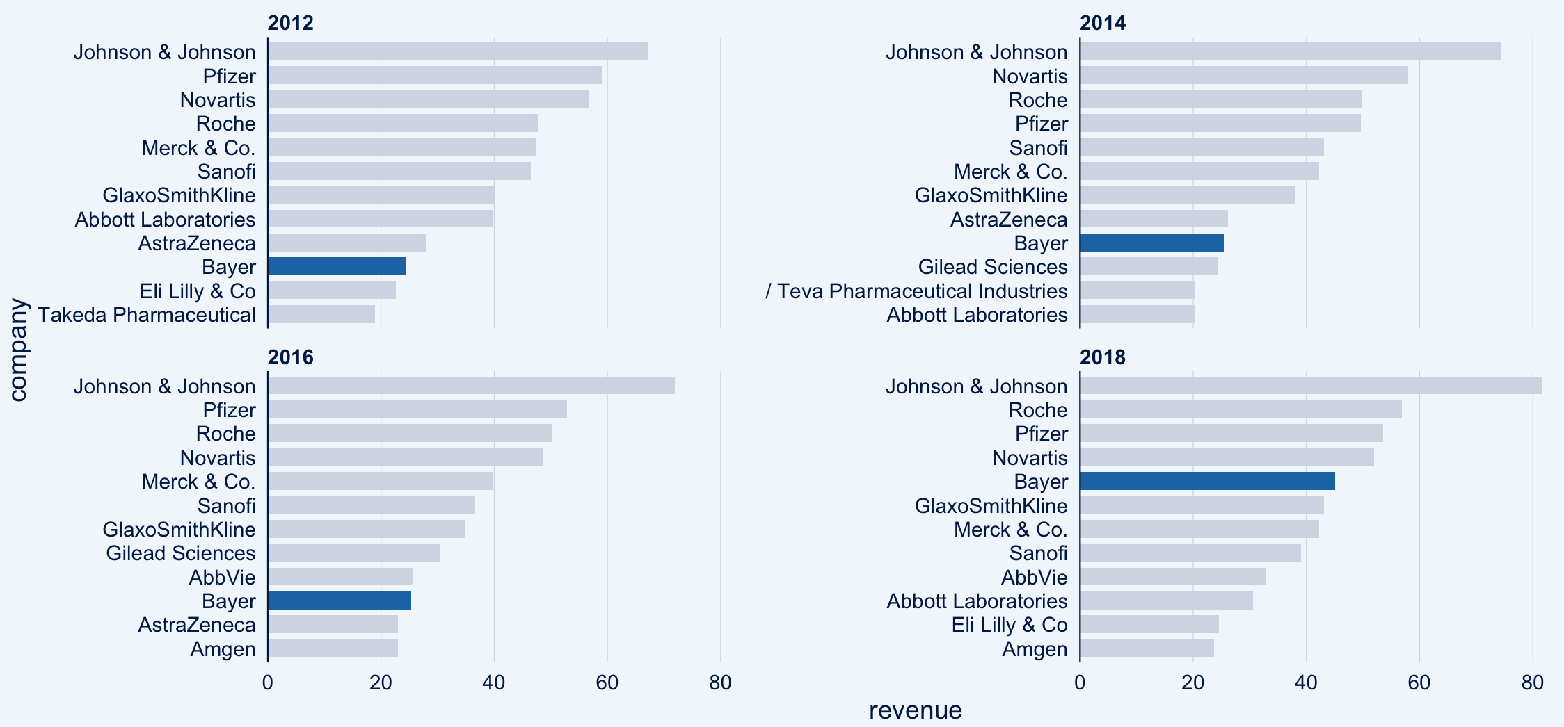 biomedicalrevenue %>%filter(year %in% c(2012, 2014, 2016, 2018)) %>%bar_chart(company,revenue,facet = year,top_n = 12,highlight = "Bayer")