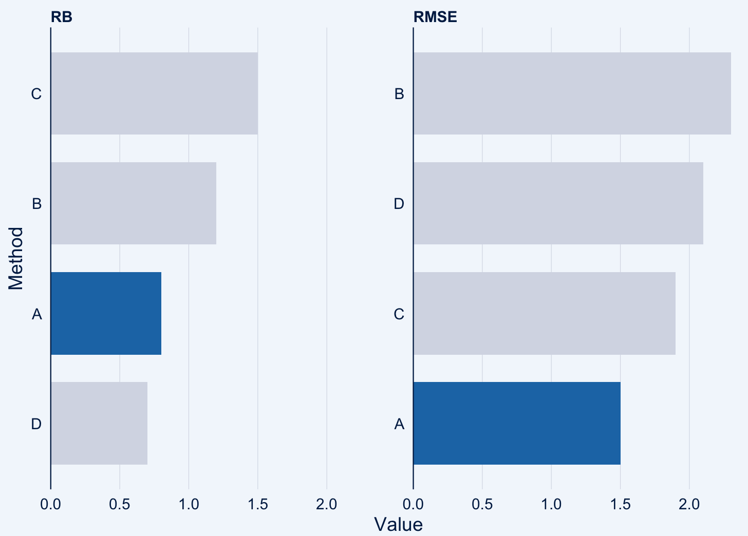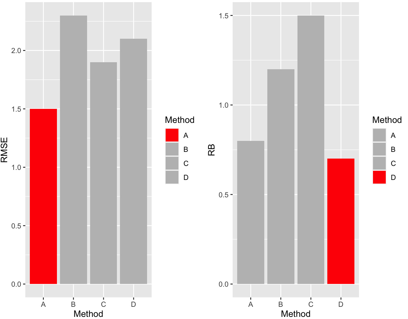 data <- data.frame(Method = c("A", "B", "C", "D"),RMSE = c(1.5, 2.3, 1.9, 2.1),RB = c(0.8, 1.2, 1.5, 0.7)