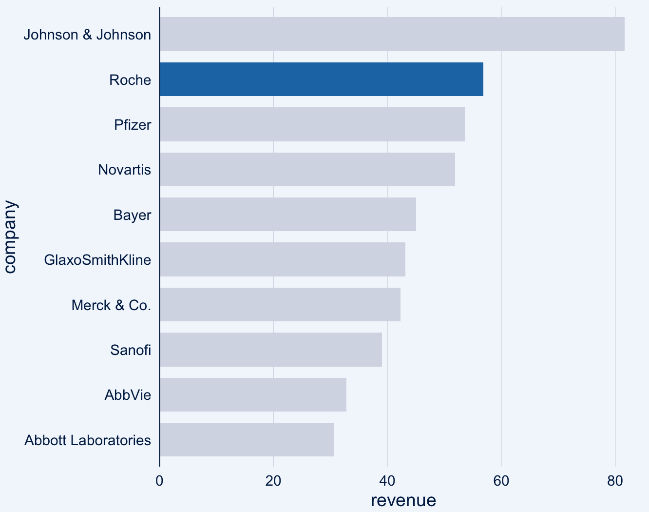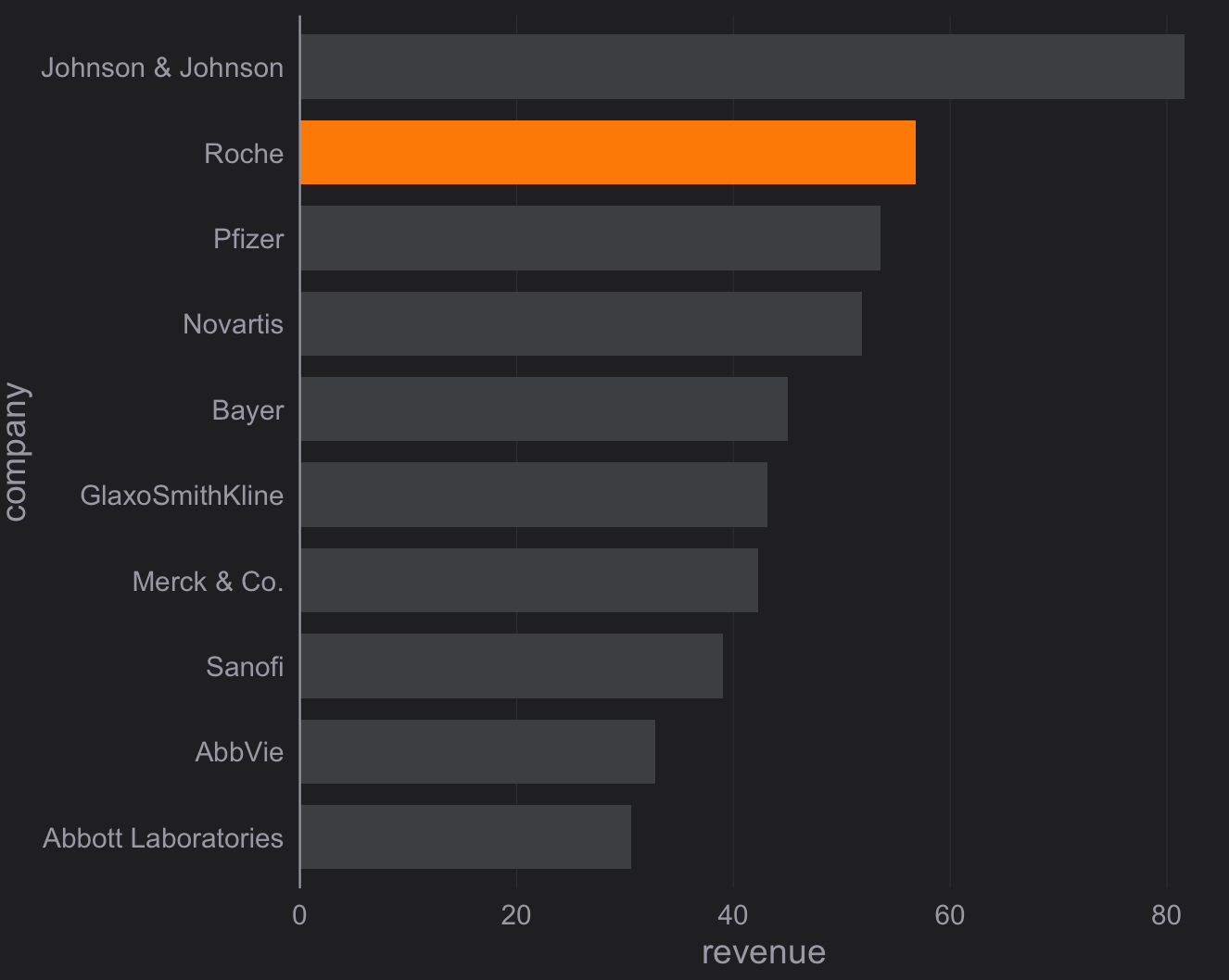 bar_chart(revenue2018,company,revenue,top_n = 10,highlight = "Roche"