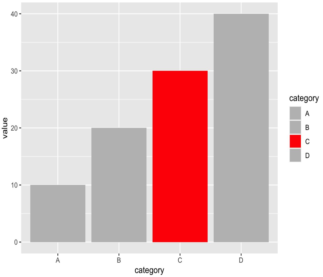 df <- data.frame(category = c("A", "B", "C", "D"),value = c(10, 20, 30, 40))