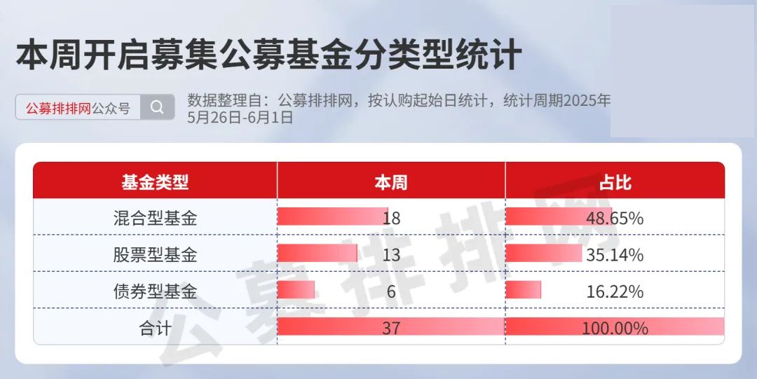 从基金类型来看,混合型基金成募集主力,本周全市场共有18只基金启动募集,占到启动募集基金总量的48.65%。其次是股票型基金,本周共有13只基金启动募集,占到总量的35.14%。再次是债券型基金,本周共有6只基金启动募集,占到总量的16.22%。
