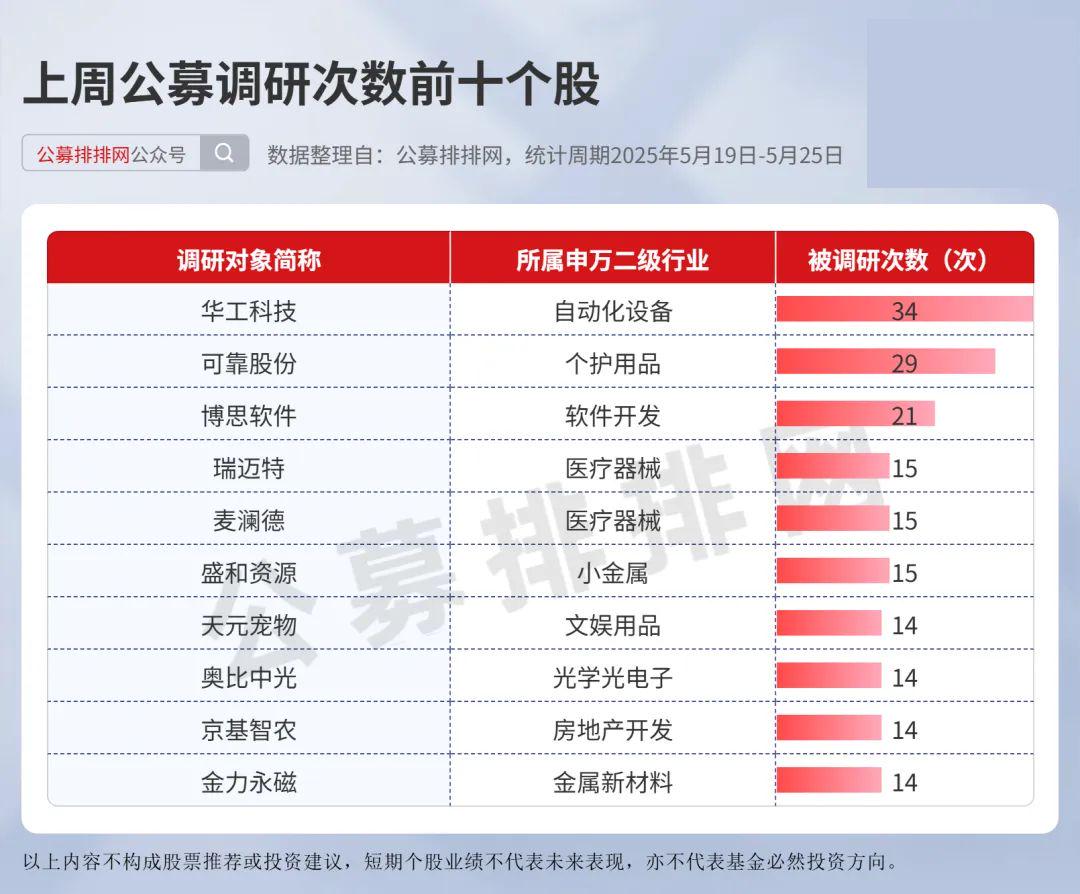 在个股调研热度榜上,自动化设备行业的龙头企业华工科技以34次调研拔得头筹,吸引了包括博时基金、华夏基金、嘉实基金、易方达基金等在内的34家头部公募机构前来调研。此外,可靠股份和博思软件也获得机构高度关注,分别收获29次和21次调研,其中可靠股份获得博时基金、华夏基金等重量级机构青睐,博思软件则吸引了华夏基金、南方基金等知名公募的关注。