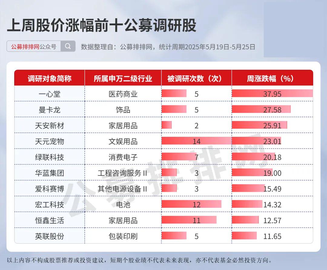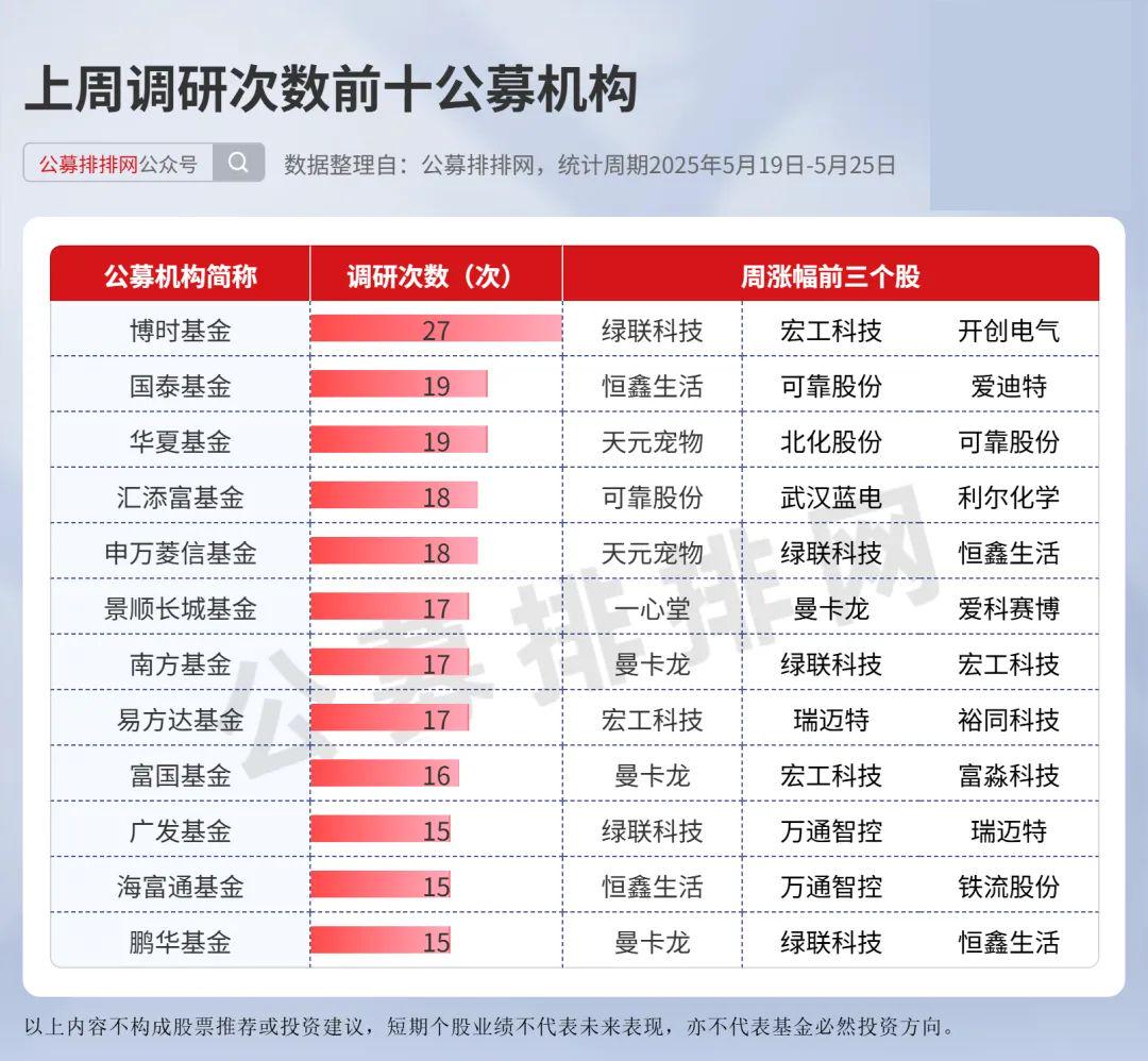 在公募机构调研活跃度排行榜上,博时基金以27次调研拔得头筹,其重点关注的绿联科技、宏工科技等标的周涨幅表现亮眼。国泰基金和华夏基金以19次调研并列第二,其中国泰基金调研的恒鑫生活、可靠股份等个股,以及华夏基金关注的天元宠物、北化股份等标的均取得显著涨幅,展现出头部公募机构优秀的选股能力。