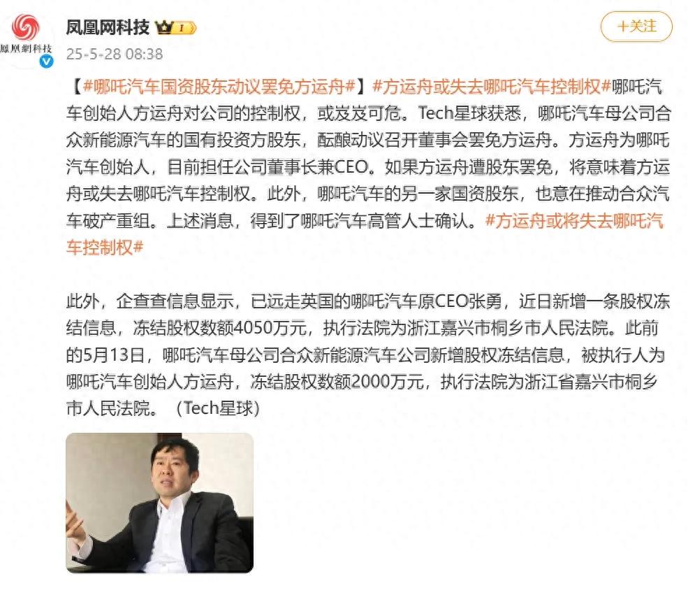 据Tech星球报道,哪吒汽车国资股东动议召开董事会罢免CEO方运舟。该报道还指出,哪吒汽车的另一家国资股东,也有意推动合众汽车破产重组一事。对于这些消息,Tech星球称已得到哪吒汽车高管人士确认。如果消息为真,或也意味着哪吒汽车将迎来重大的变化,方运舟将失去对哪吒汽车控制权。