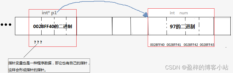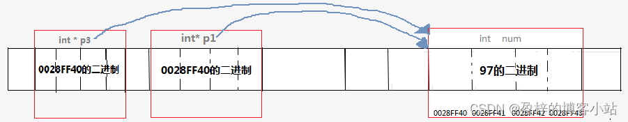 *p1 : 将从地址0028FF40 开始解析,因为p1是int类型指针,int占4字节,因此向后连续取4个字节,并将这4个字节的二进制数据解析为一个整数 97。