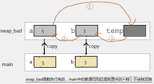 {int a = 5;int b = 3;swap_bad(a,b);       //Can`t swap;swap_ok(&a,&b);      //OKreturn 0;