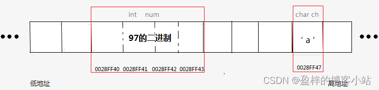 我们可以大致画出变量ch和num在内存模型中的存储。(假设 char占1个字节,int占4字节)