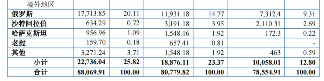 目前,志高机械在境外市场的收入主要来源于俄罗斯、沙特阿拉伯和哈萨克斯坦,这些国家的收入合计占外销收入的比例分别为95.40%、88.32%和84.91%。