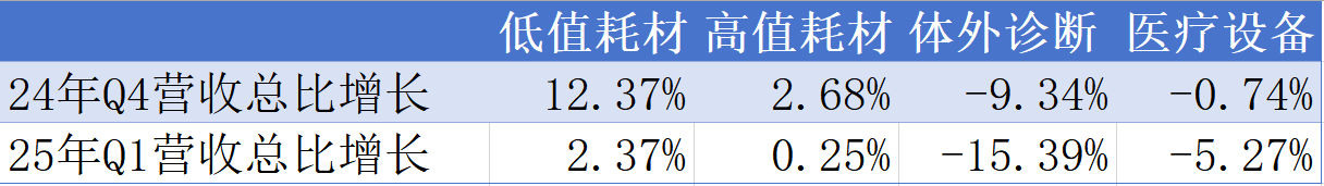 低值耗材板块在低基数效应逐步消除后,一季度回归常态增长趋势。值得注意的是,目前低值耗材企业较多选择出海,后续评估需要关注地缘风险。