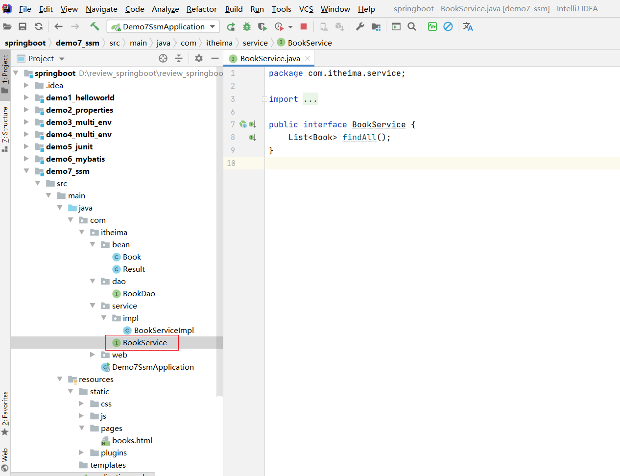 `package com.itheima.service;import com.itheima.bean.Book;import java.util.List;public interface BookService {List findAll();