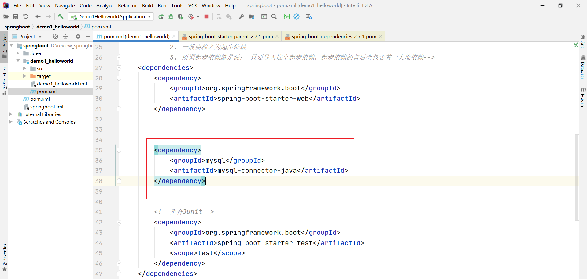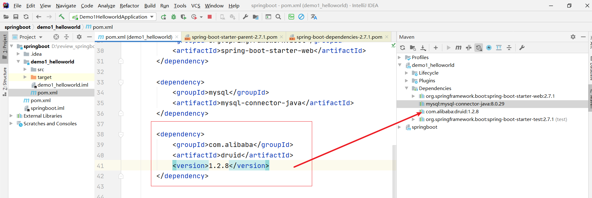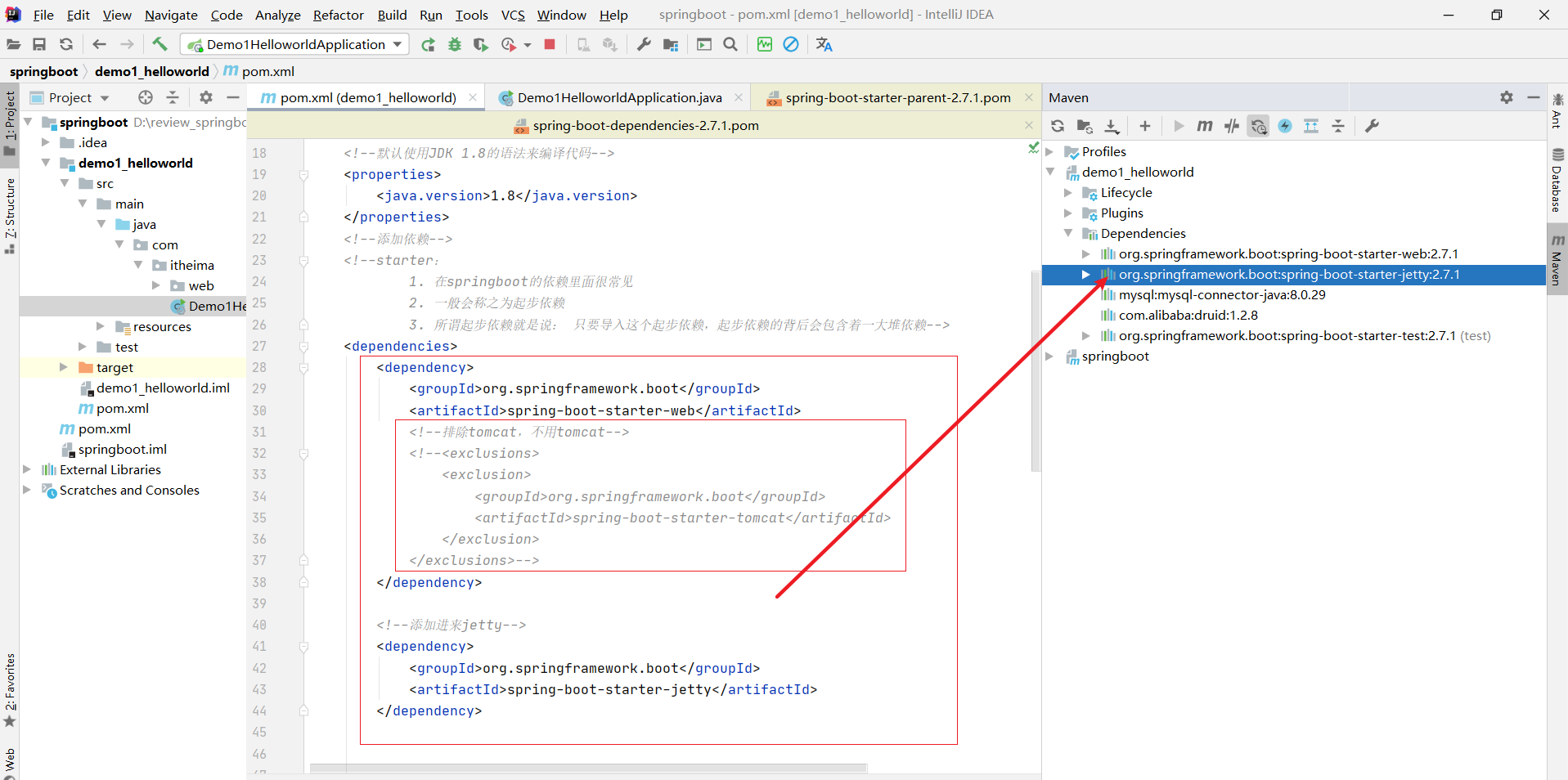 4.0.0 org.springframework.boot spring-boot-starter-parent 2.7.1 com.itheima demo1_helloworld 0.0.1-SNAPSHOT demo1_helloworld Demo project for Spring Boot 1.8 org.springframework.boot spring-boot-starter-web org.springframework.boot spring-boot-starter-jetty mysql mysql-connector-java com.alibaba druid 1.2.8 org.springframework.boot spring-boot-starter-test test org.springframework.boot spring-boot-maven-plugin