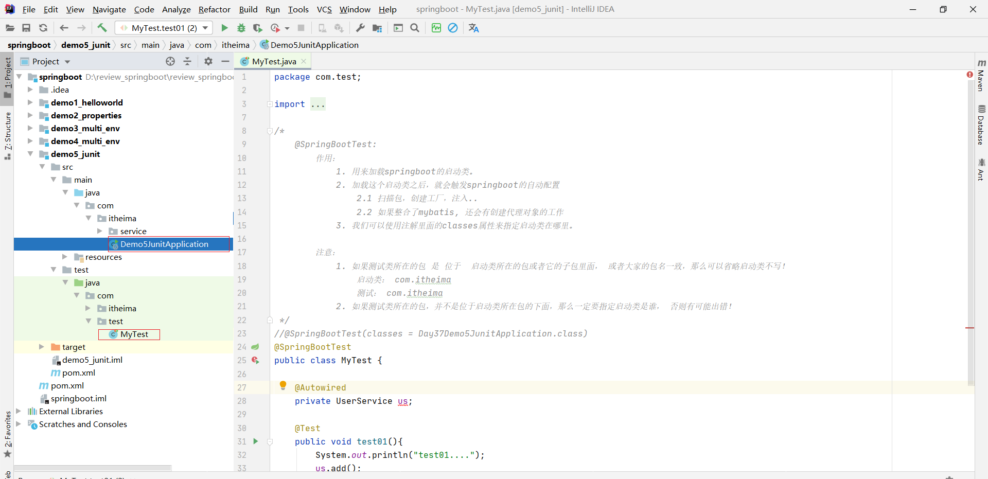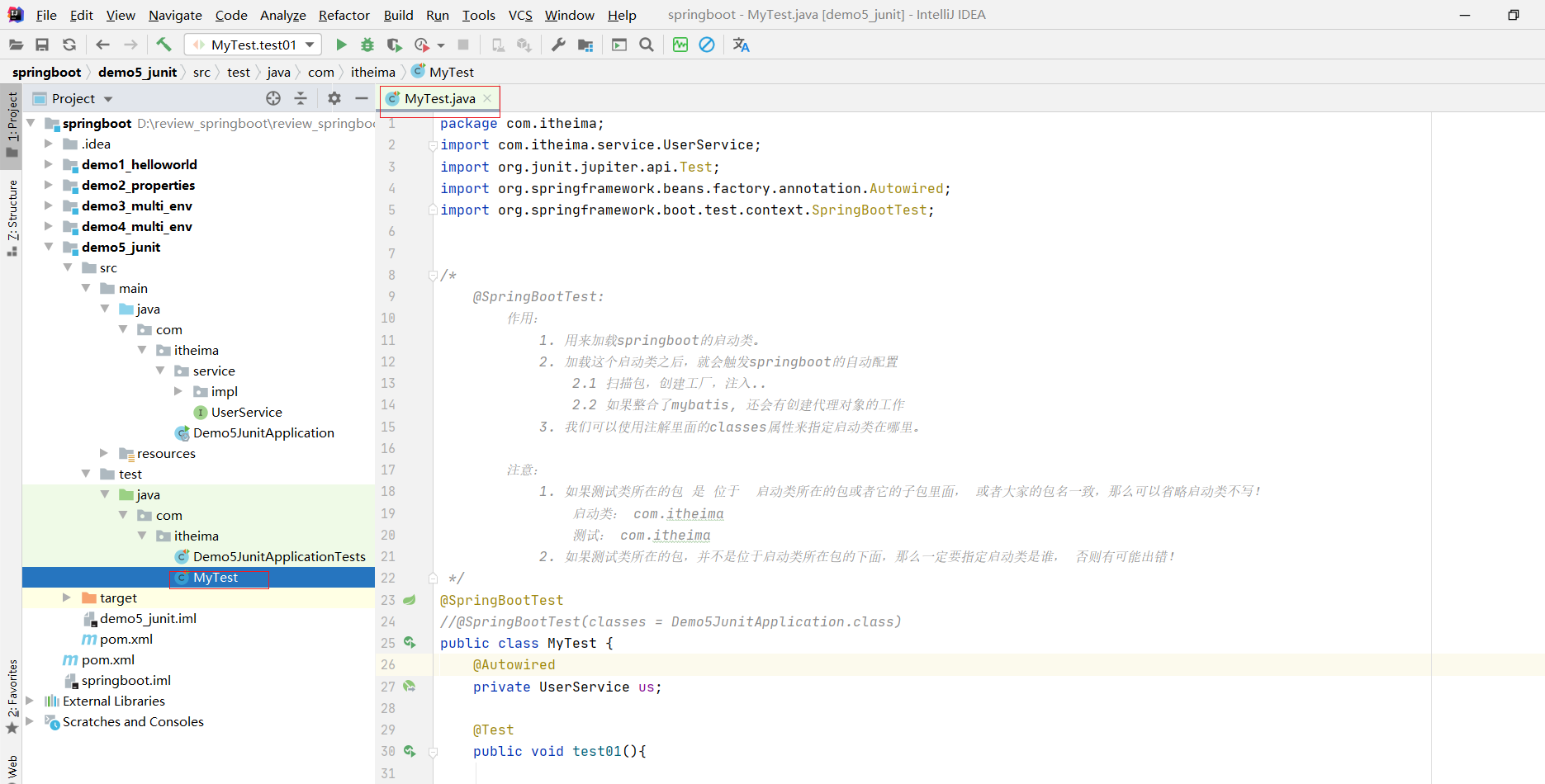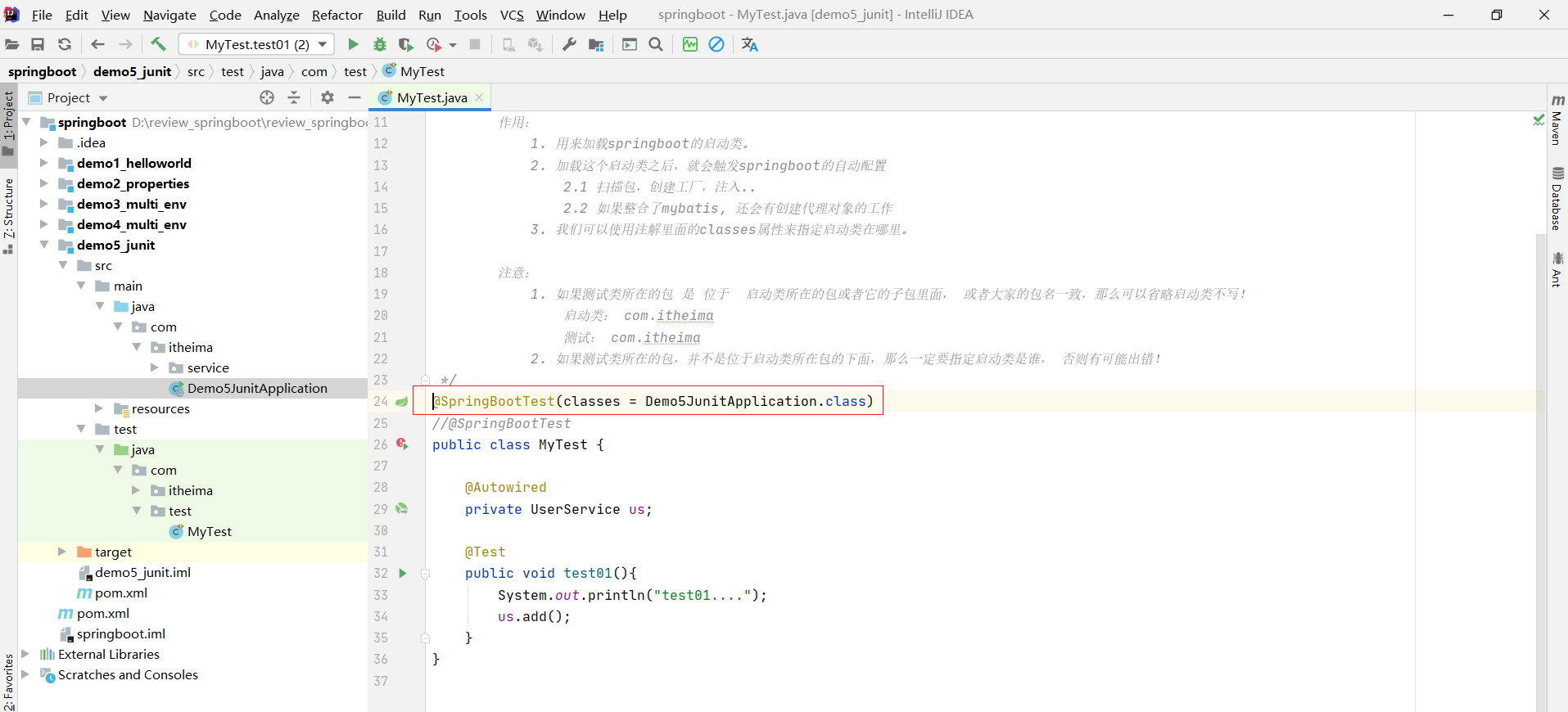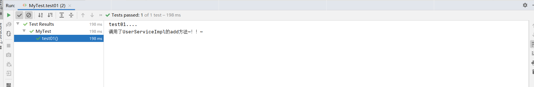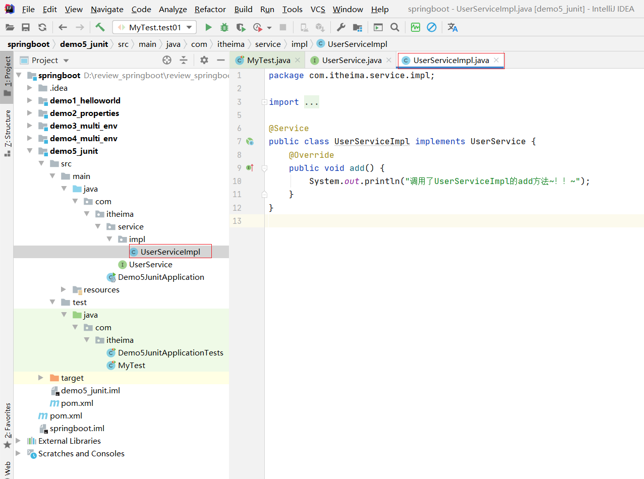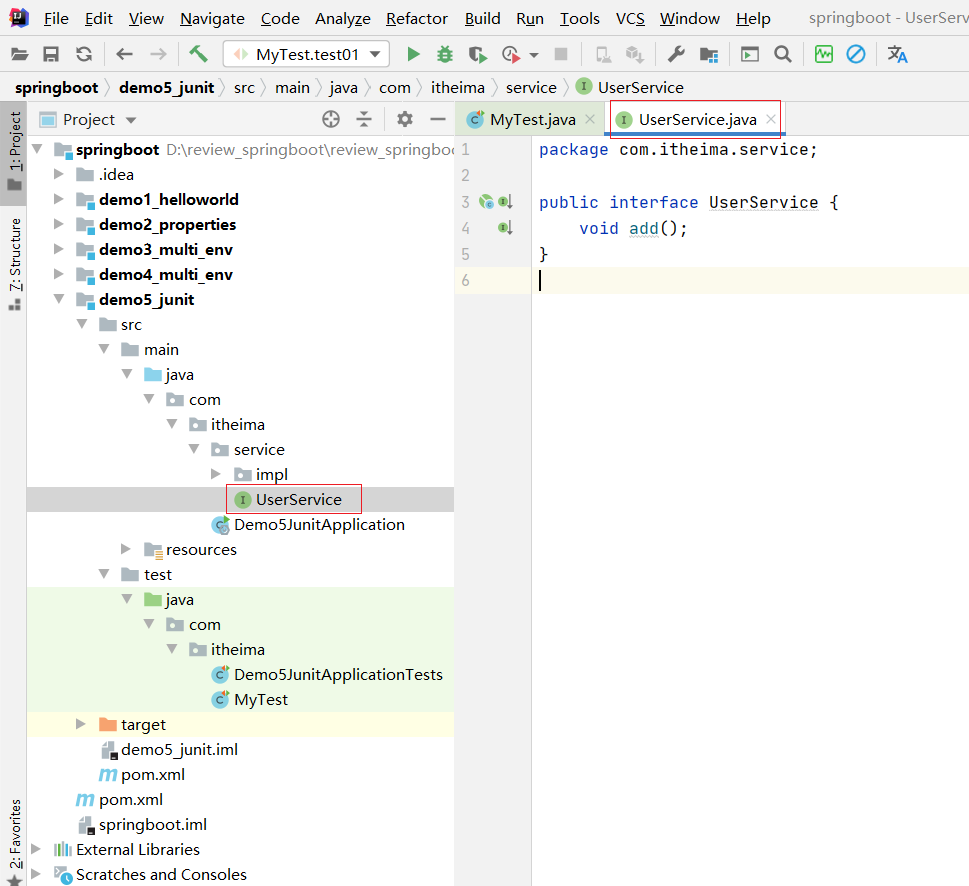public class MyTest {@Autowiredprivate UserService us;@Testpublic void test01(){System.out.println("test01....");us.add();}
