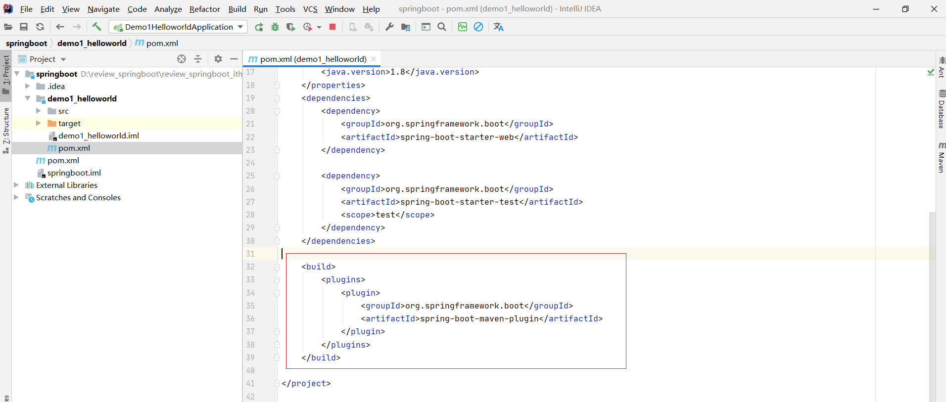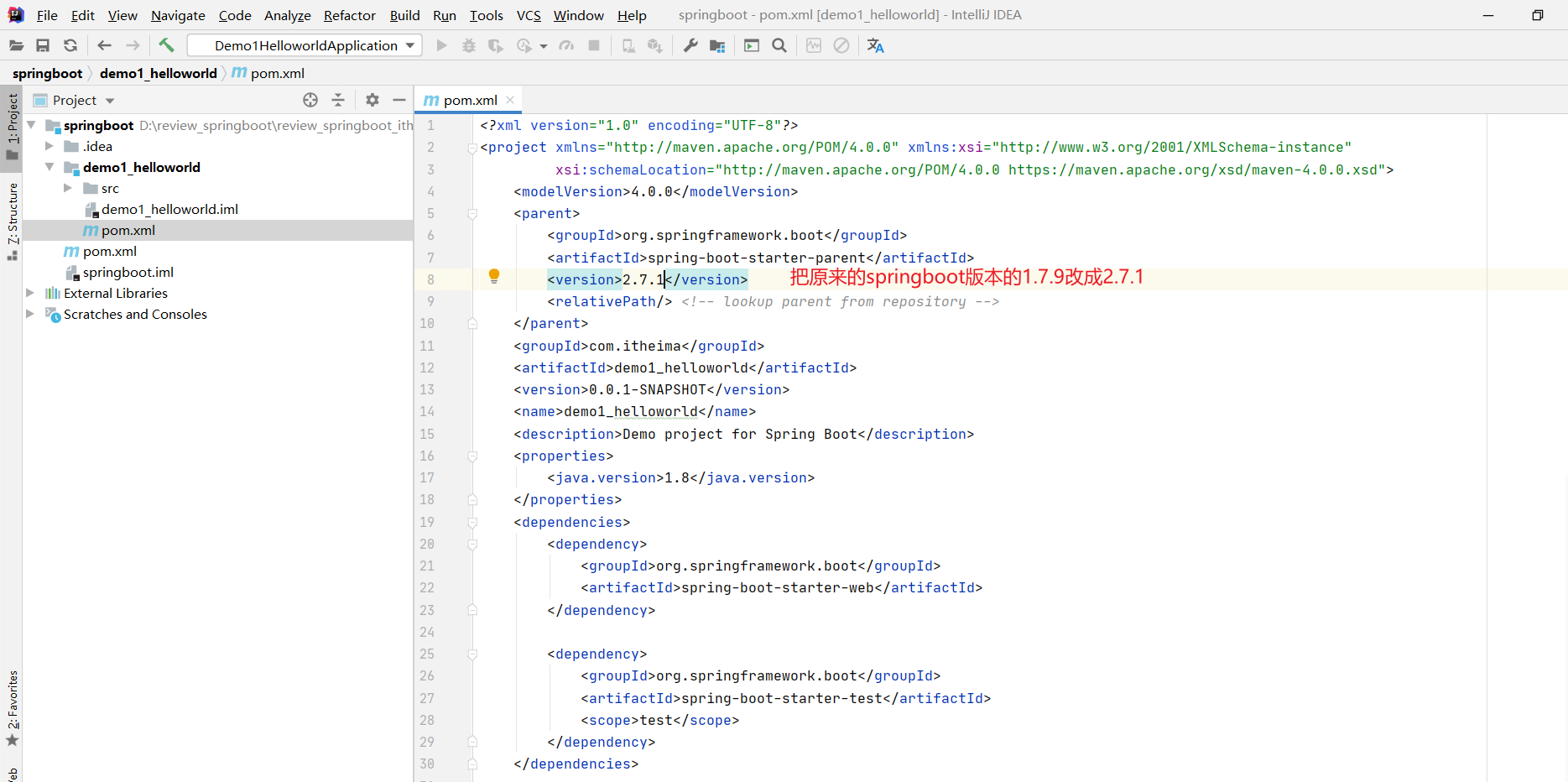 4.0.0 org.springframework.boot spring-boot-starter-parent 2.7.1 com.itheima demo1_helloworld 0.0.1-SNAPSHOT demo1_helloworld Demo project for Spring Boot 1.8 org.springframework.boot spring-boot-starter-web org.springframework.boot spring-boot-starter-test test org.springframework.boot spring-boot-maven-plugin