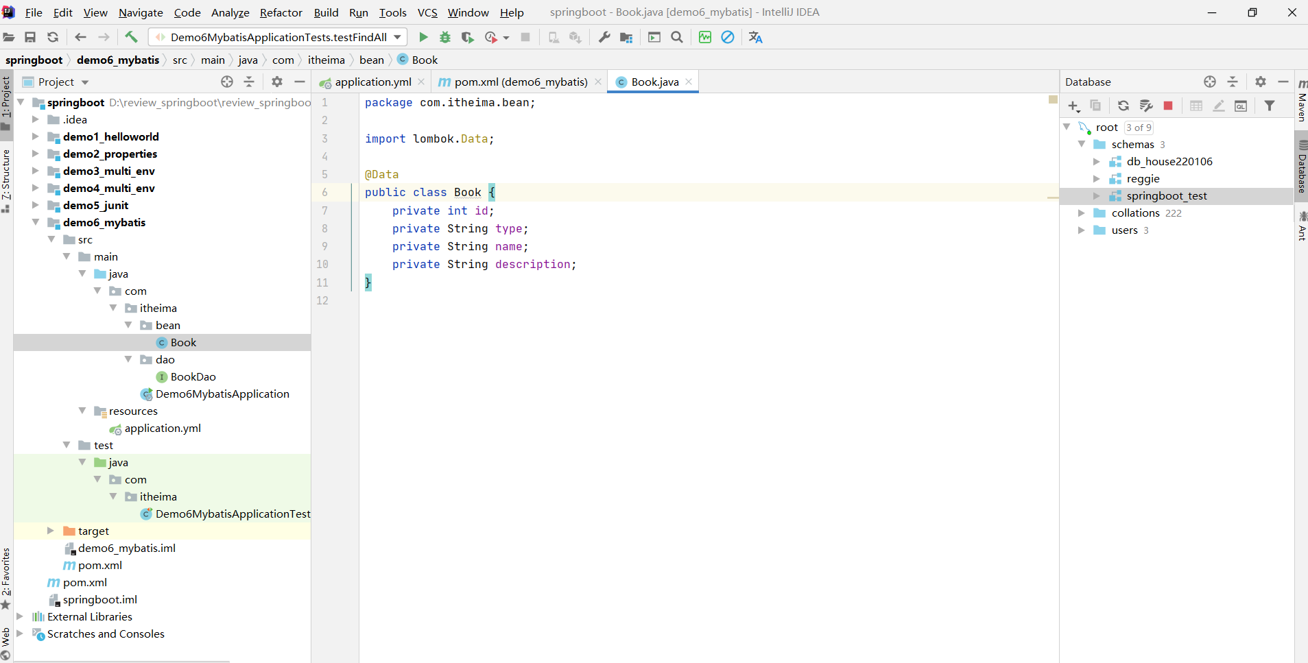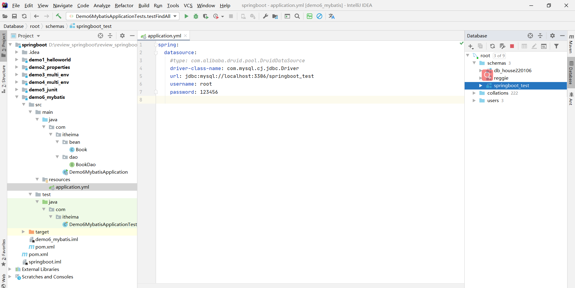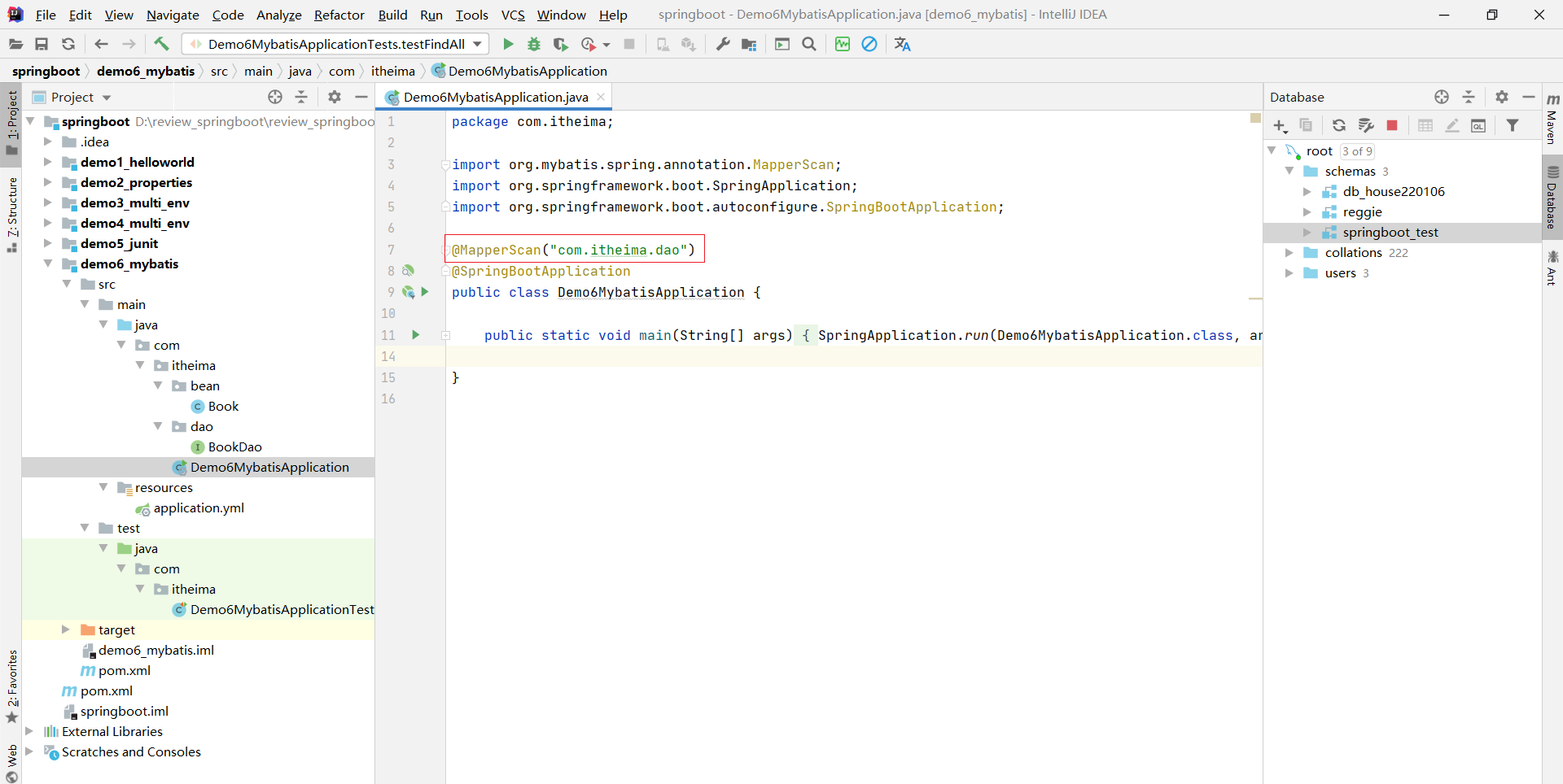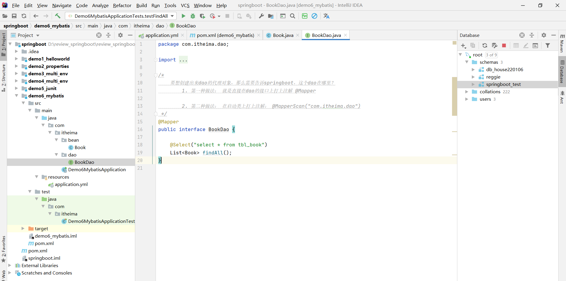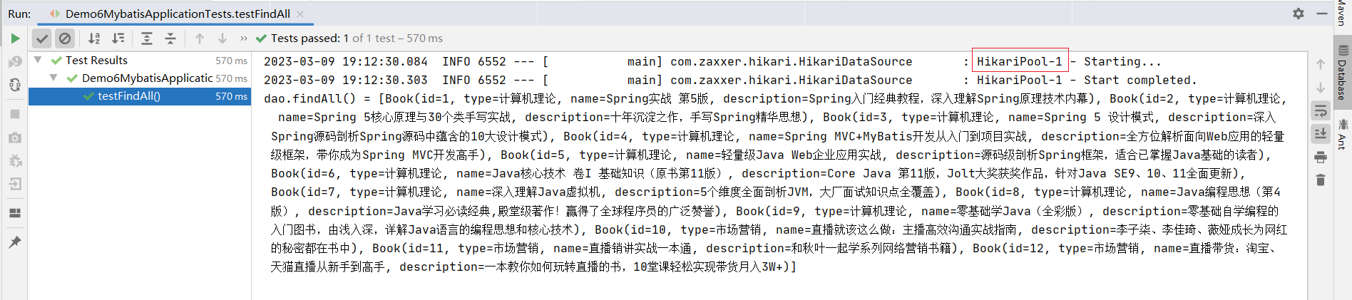 class Demo6MybatisApplicationTests {@Autowiredprivate BookDao dao;@Testvoid testFindAll() {System.out.println("dao.findAll() = " + dao.findAll());}